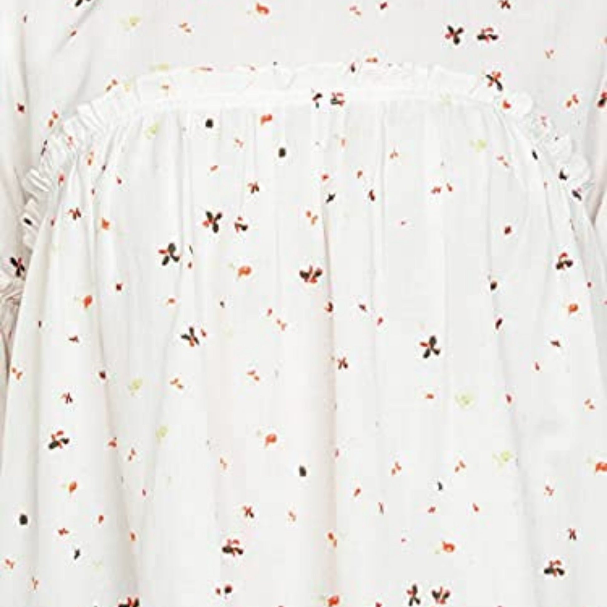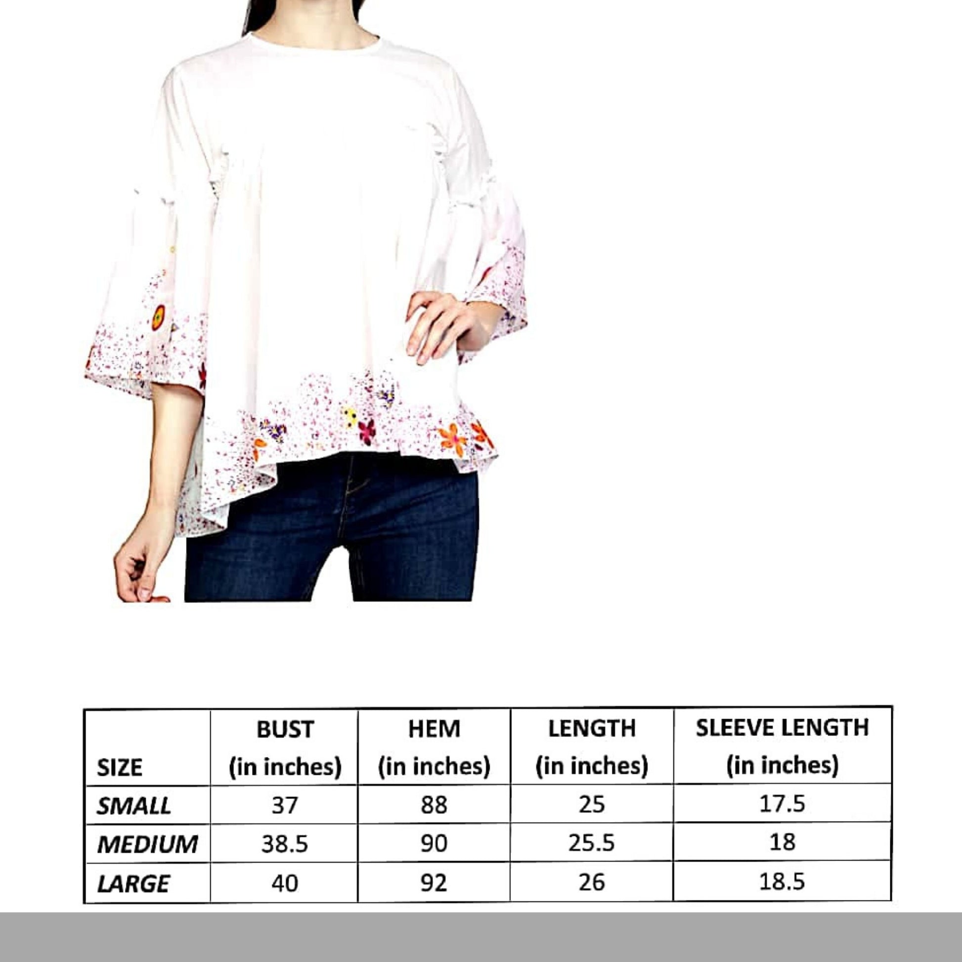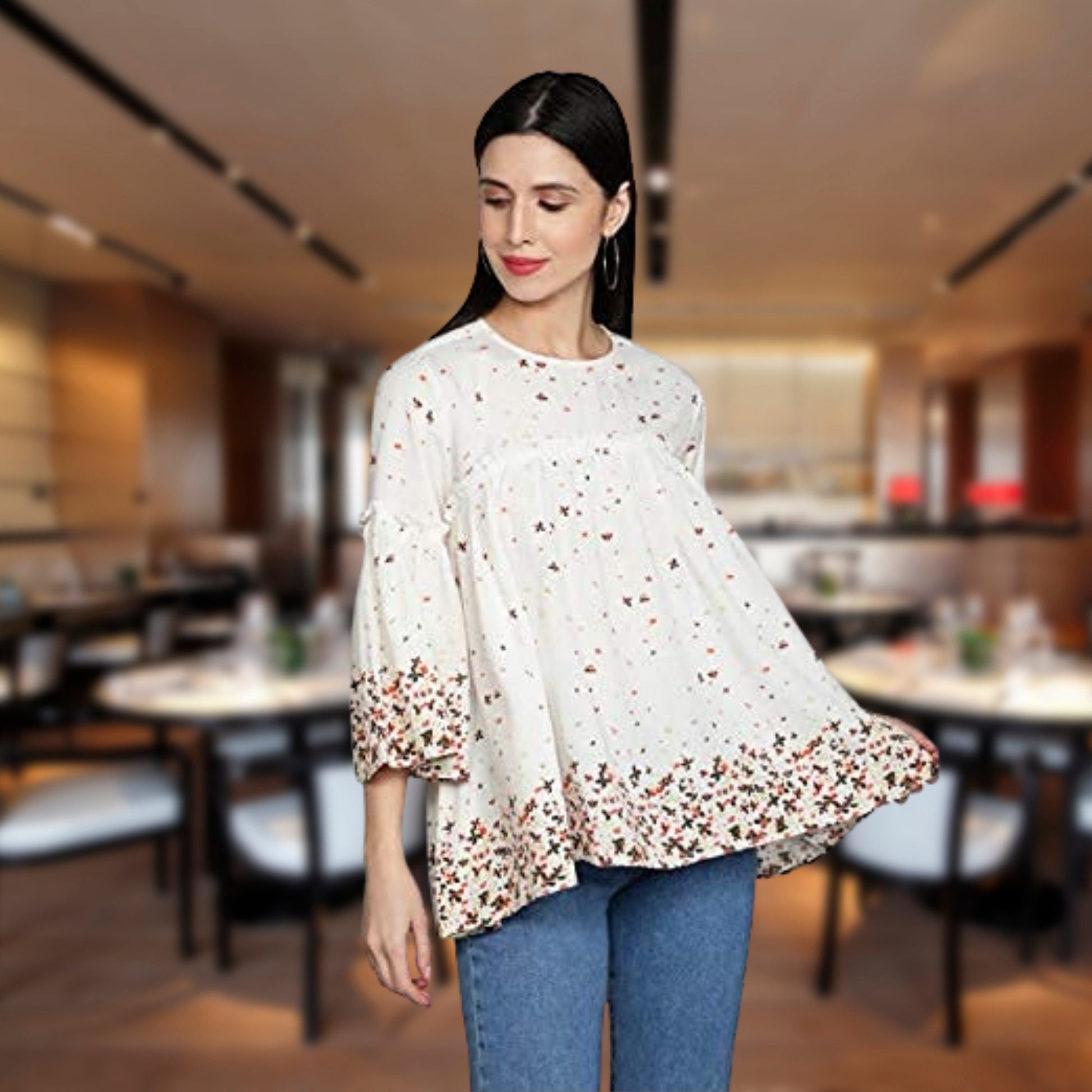 Unlock your inner royalty with the luxurious Emma Top Off White. Boasting beautiful ruffles, a round neck, and 3/4 bell sleeves, this top is sure to enliven any ensemble. With its floral prints, you'll be ready to turn heads in style.
